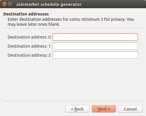 You'll see your destination addresses in the list, and lots of "INTERNAL" meaning transactions that send back to the wallet (in the next mixdepth). Click Run Schedule and the tumbler will start. As it progresses, you'll see updates to the schedule (in particular the last entry in each list will change from 0 to txid to 1 when finished). The full tumbler run will usually take at least a few hours, as you'll understand if you read the wiki page linked above.
