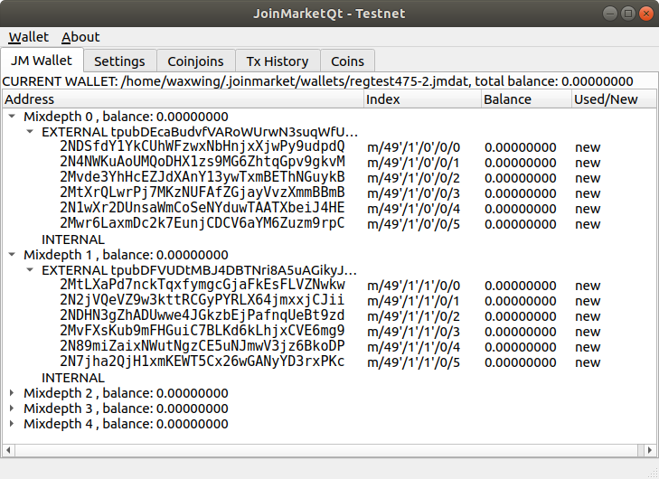 Start out by putting some coins into the first address in the "EXTERNAL" section of mixdepth 0. Once you have coins in the wallet it will show something like this (after a few transactions):